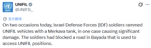 联黎部队指出,过去一周内,以色列士兵在该地区多次进行所谓的“警告性射击”,击中并损坏了有明显联合国标识的车辆。在一起事件中,一发子弹距离已下车的维和人员仅约一米,险些造成人员伤亡。